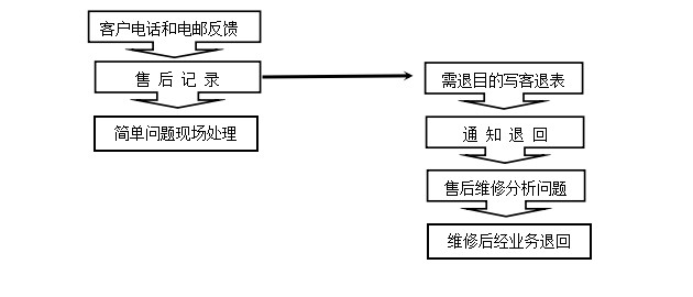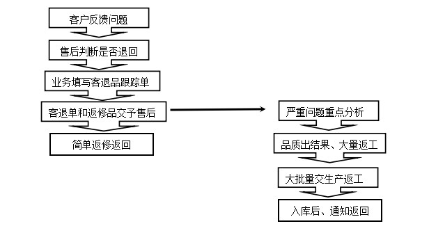 1)當售后接到客戶反饋的問題后,判斷是否需要返回維修,需要退回的,跟業(yè)務交流后,業(yè)務部通知客戶退回。業(yè)務收到客退品后,填寫《客退品跟蹤單》和返修品交維修部。