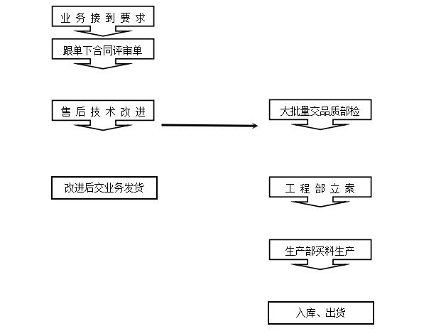 1)當業(yè)務部接到特殊訂單時,跟單根據(jù)業(yè)務員提供客戶的要求下《合同評審單》。交與售后,售后根據(jù)單據(jù)要求領料改進。小批量樣品改進檢測合格后,(10套以下)交業(yè)務部發(fā)給客戶。