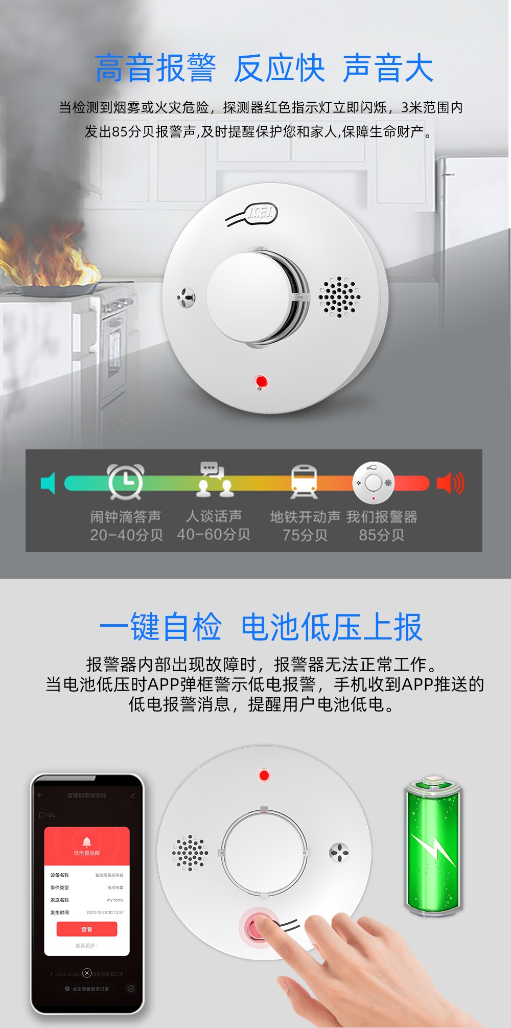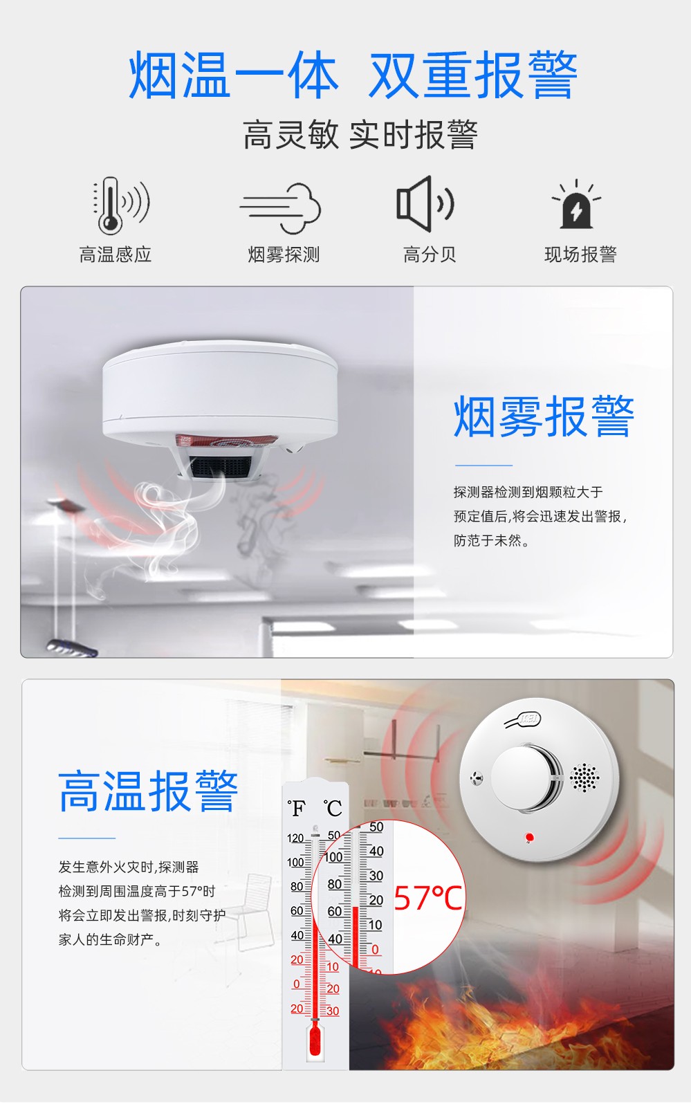 光電式感煙火災(zāi)探測(cè)報(bào)警器,采用特殊結(jié)構(gòu)設(shè)計(jì)的紅外光電傳感器、性能可靠的MCU,具有靈敏度高、穩(wěn)定可靠、 耗電小、美觀耐用、使用方便等特點(diǎn)。獨(dú)立款產(chǎn)品內(nèi)部具備光電傳感器,煙溫一體款產(chǎn)品的內(nèi)部具備光電煙霧傳感器和溫度傳感器,當(dāng)報(bào)警器觸發(fā)報(bào)警時(shí),會(huì)發(fā)出無(wú)線信號(hào)給報(bào)警主機(jī),