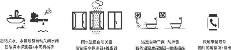 智慧養(yǎng)老系統(tǒng)具備智能漏水探測器,智能溫濕度探測器,智能插座等設備可自動關閉水閥,浴室自動干爽,自動關窗,落實到每一處細節(jié),時刻守護老人。