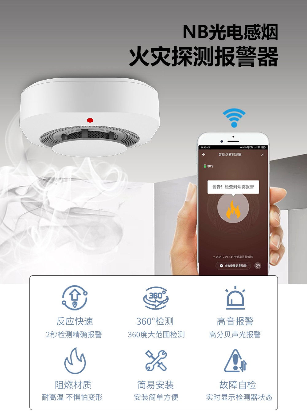 4.報警方式 NB煙感:立體復(fù)合報警,PC平臺、電話、短信、APP、本地聲光。 傳統(tǒng)煙感:報警單一,不能遠(yuǎn)程報警