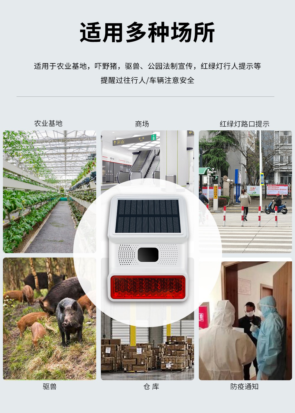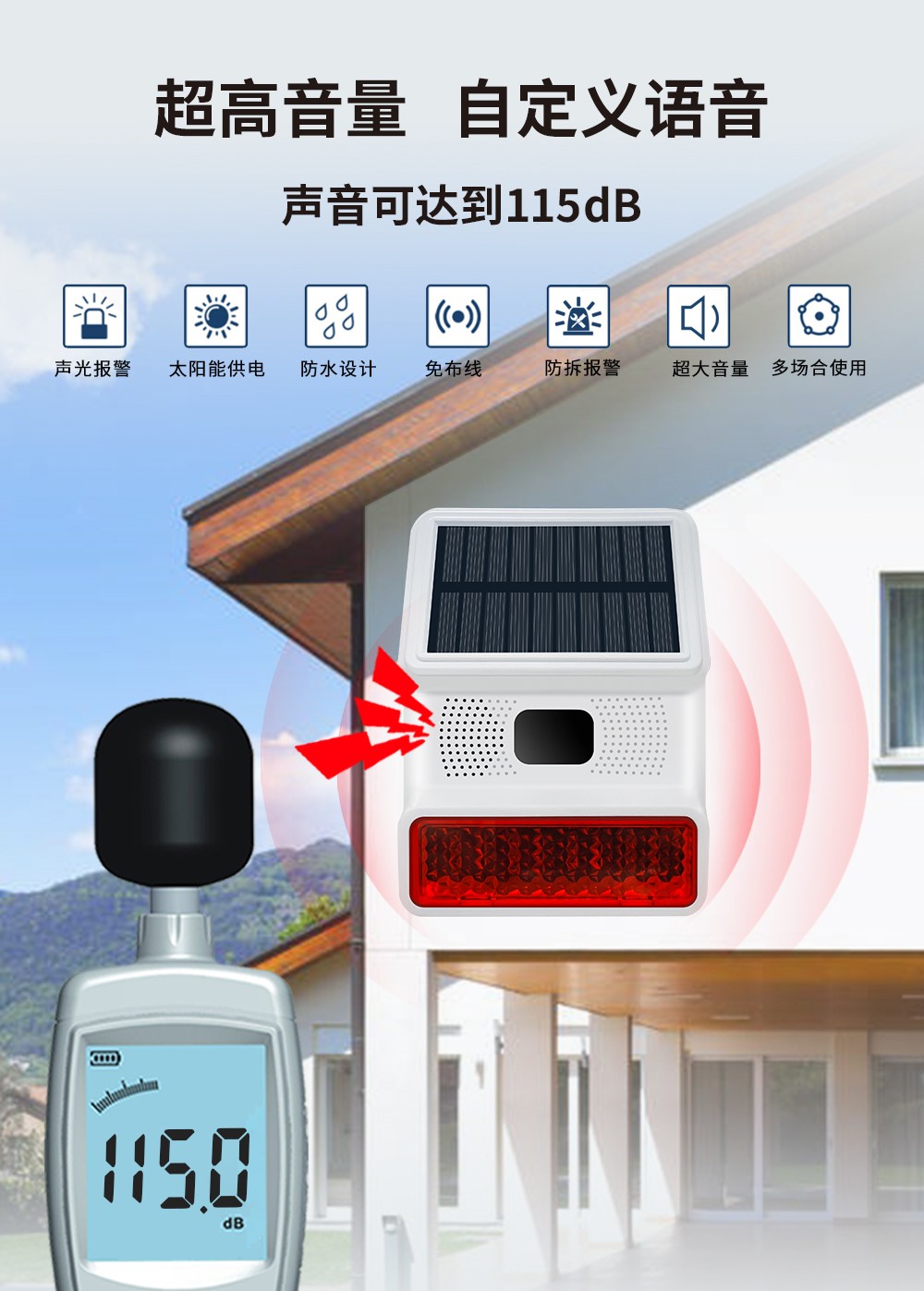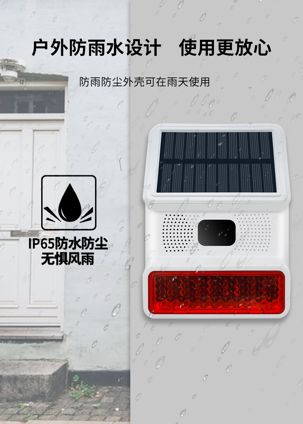 無線太陽能紅外聲光報(bào)警器分為聯(lián)網(wǎng)型和RF型,探測距離8-12米,角度110度,這是一款可以自定義報(bào)警語音,高性能的帶太陽能充電的戶外數(shù)字被動(dòng)紅外現(xiàn)場聲光報(bào)警器。能夠有效防水、防塵、防蟲、防風(fēng)和其他戶外干擾因素。該產(chǎn)品應(yīng)用如下先進(jìn)技術(shù):超低功耗芯片技術(shù),WiFi聯(lián)網(wǎng)技術(shù),NB/4G無線通訊技術(shù),太陽能持續(xù)充電和供電,音頻和高亮度閃燈同時(shí)報(bào)警提醒。使用穩(wěn)定、性能先進(jìn)、IP-65防水的整體結(jié)構(gòu)設(shè)計(jì),可以應(yīng)用于商鋪、別墅、養(yǎng)殖場、森林防火、高壓電桿、公園、倉庫、碼頭等一切需要現(xiàn)場語音和強(qiáng)光警示的地方。